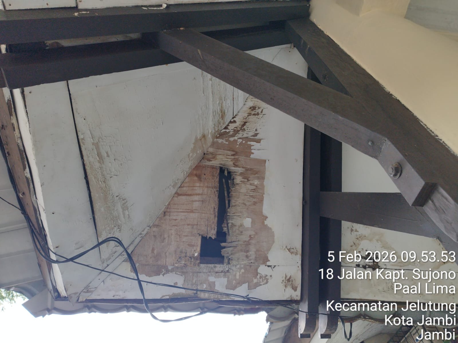 Terlihat banyak bagian bangunan yang rusak, termasuk plafon yang jebol, serta rangka atap kayu yang patah.